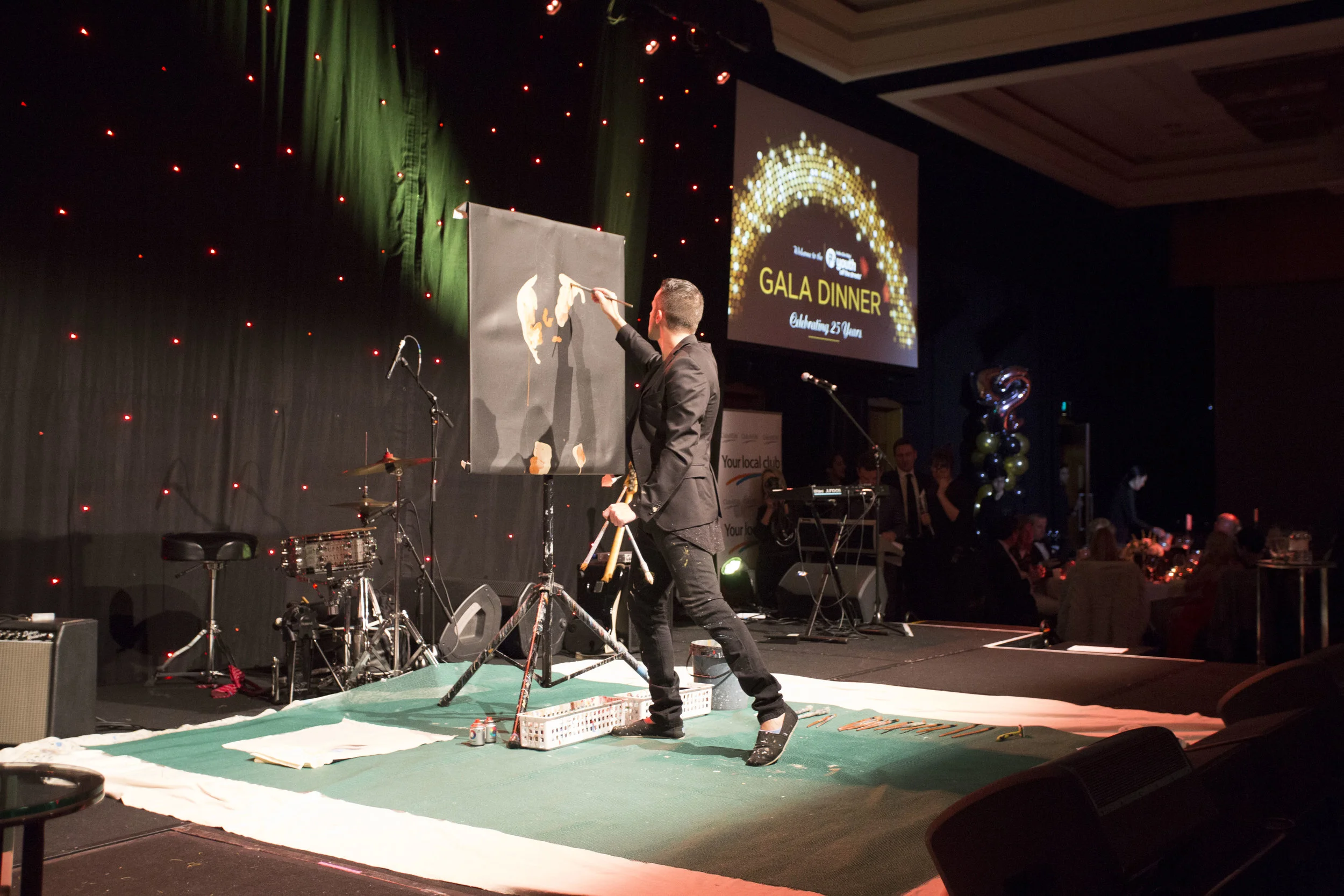 Starting with a blank 6ft X 4ft canvas Matteo creates live on stage portraits that tell stories of their own, creating lasting interest from each audience member during every second of his performance. Matteo utilizes the platform of art to engage with his audience on a personal level allowing the portraits to become an introduction to the artist who is Matteo Charles, resulting in an inspirational story of a life of pain, near death experience, to living his dream, captivating audiences from the ages of 5 to 105.